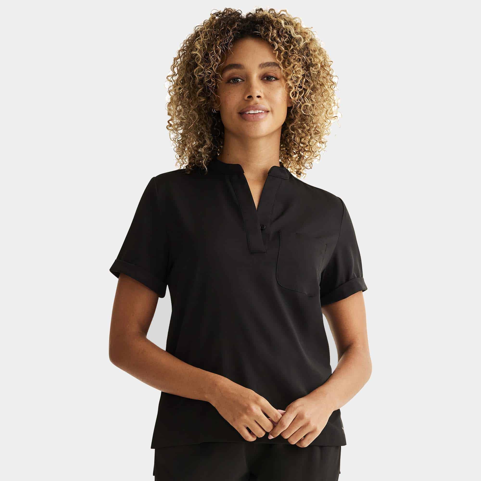 This Macy Top is crafted with the ideal blend of soft yet durable fabric. It features 1 chest pocket and a stylish Mandarin collar with a half placket. The high-low hem and side vents allow for ease of movement, while the French cuffs and Modern fit create a flattering silhouette. Center back length: 25″.