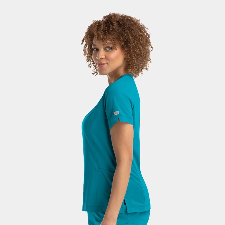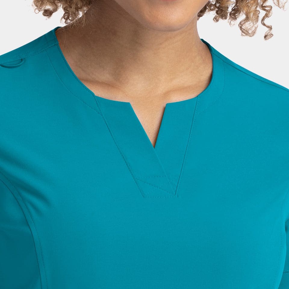 Find perfection with our Women’s Notched Crewneck Top: adjustable fit, DTM bungee loop, two slant pockets + zip pocket, and flattering seams. Eco-friendly fabric blend, with side slits for mobility.